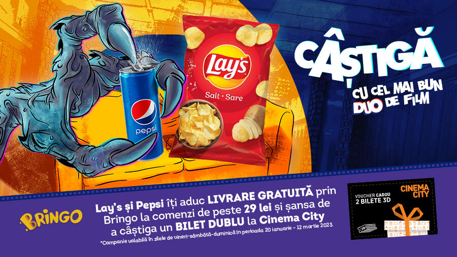 d. Sa achizitioneze prin intermediul aplicatiei Bringo, orice produse Lay’s si Pepsi, in orice combinatie, in valoare de minim 29 lei, in cadrul aceleiasi comenzi, din hipermarketurile Carrefour, Penny sau hipermarketurile Cora, în funcție de stocul disponibil din cadrul magazinului in momentul plasarii comenzii ("Magazine Participante”) in urmatoarele intervale: